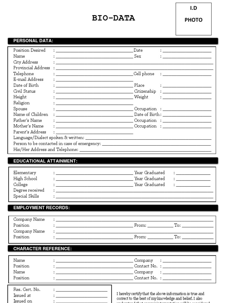 Good luck with your job search! They mention your objective, qualifications, skills, hobby, work experience, and in the case of personal biodata, your details like marital. First, download the simple biodata form file in the format you are interested in. A biodata, short for biographical data, can be several types of documents. Special immigrant visa biodata form.